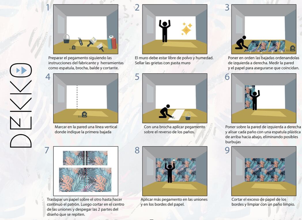Una vez verificado lo anterior. comience a preparar los elementos para la instalación. Los papeles personalizado de DEKKO vienen enumerados, y la hoja de instalación lo gráfica, e indica el orden de los paños deben instalarse en ese orden. Puede existir una diferencia de color con respecto a lo que se ve en pantalla y al perfil y sustrato escogido, eso no es tomado como falla de fabricación.